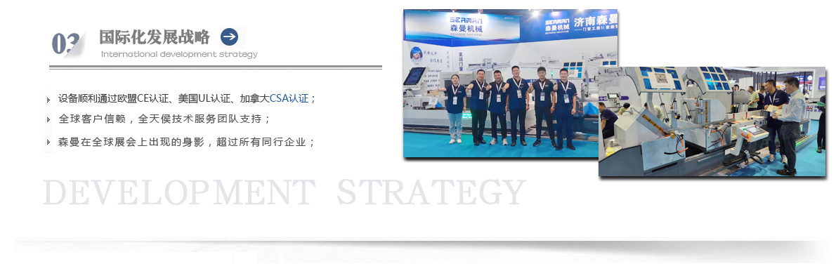“森曼機械”作為全球門窗設備供應商,本著"seaman"精神,勇立潮頭,拼搏創(chuàng)新,以爭做行業(yè)為目標,在行業(yè)前輩發(fā)展的基礎上,努力學習,積極進取。目前公司產品涵蓋塑料門窗設備、鋁合金門窗設備、鋁幕墻設備、鋁木復合門窗設備及中空玻璃設備五大種類,近百個品種。公司產品銷售至全國各地及東南亞、非洲、東歐、北美等幾十個國家和地區(qū)。在這個競爭激烈的年代,我們正努力使我們的產品!